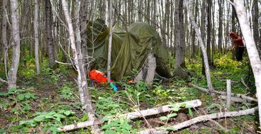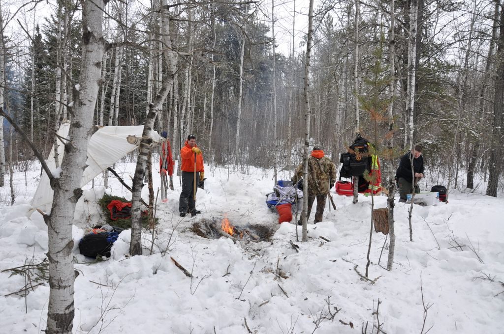 Team members practise wilderness survival and shelter construction. A bivouac demonstrates practical skills in low-visibility environments.